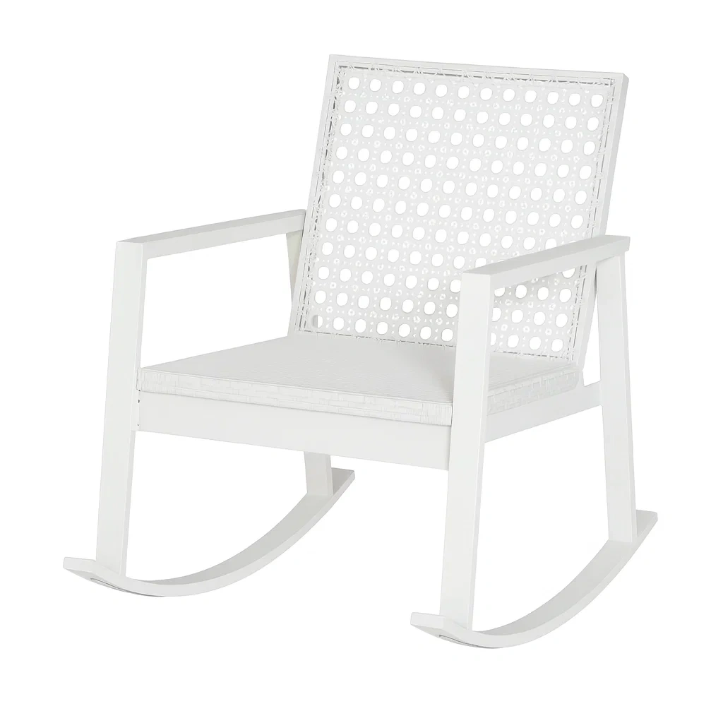 Der Schaukelstuhl besteht aus einer robusten Aluminiumstruktur und einem weißen Polyrattan-Geflecht an der Rückenlehne.